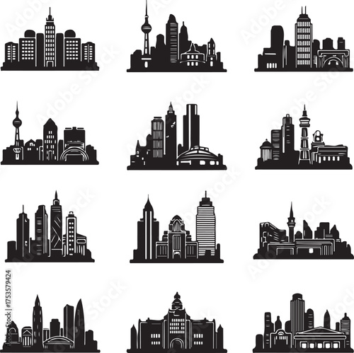 Naklejka premium Silhouetted Cityscape Vector Graphics Collection Showcasing Diverse...