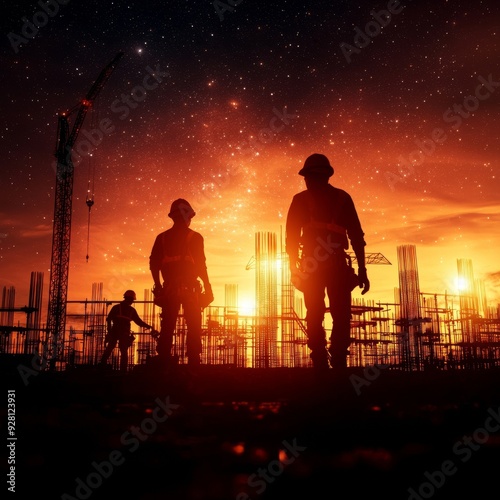 © Naphol, Obraz premium Silhouetted construction workers against a stunning sunset, capturing the essence of hard work and dedication in urban development.