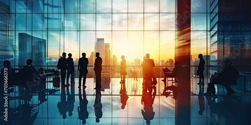 © Wuttichai, Obraz premium Silhouetted corporate connection. Diverse group of business professionals in city airport discussing and planning against backdrop of sunset. Urban dynamics. Team of walking through airport terminal