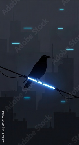 © Hungarian, Fototapeta premium Silhouetted corvid perches upon a glowing neon tube against a dark metropolitan skyline
