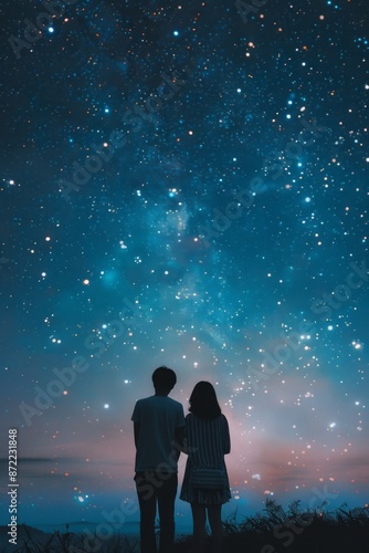 © KerXing, Obraz premium Silhouetted couple gazing at a starry night sky