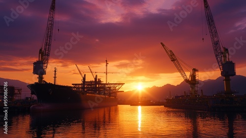 © Pornarun, Fototapeta premium Silhouetted cranes and a cargo ship at sunset, reflecting in the water of a harbor.