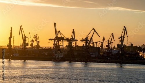 Obraz premium Silhouetted Cranes at Port During Golden Hour Against Sunset Sky