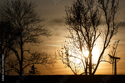 © otterspeer.com Stock, Naklejka premium Silhouetted cyclist rides along a pathway beside trees at sunset, creating a serene evening atmosphere