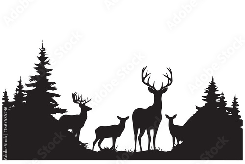 © Neko funny, Fototapeta premium Silhouetted Deer Family and Forest Scene in Monochrome Peaceful Wilderness