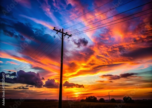 © Man888, Naklejka premium Silhouetted Electric Pole at Sunset - Dramatic Night Photography Stock Image