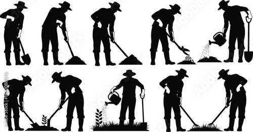 © jack, Obraz premium Silhouetted farmers gardening with tools