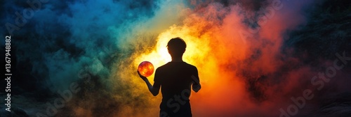© Murda, Naklejka premium Silhouetted figure holds glowing orb in colorful clouds.