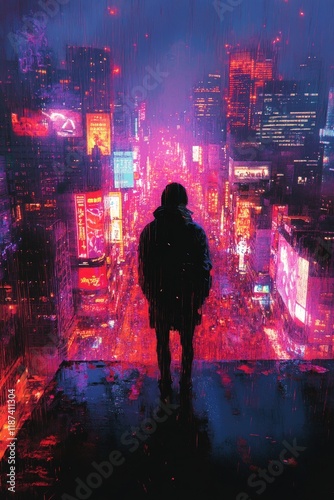 © Ali, Fototapeta premium Silhouetted figure overlooking rainy cyberpunk city.