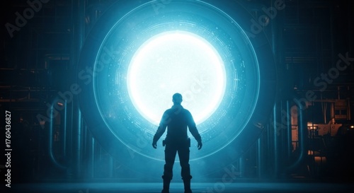 Fototapeta premium Silhouetted figure stands before a large, bright, circular portal/machine