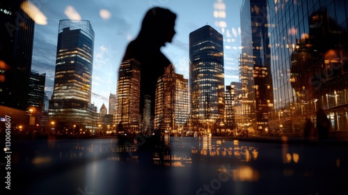 Fototapeta premium Silhouetted figures and a cityscape blend together, portraying the hustle and vibrancy of urban professional life.