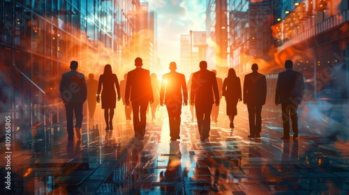 Obraz premium Silhouetted figures of businesspeople walking towards a brightly lit cityscape, giving a feeling of purpose and new beginnings