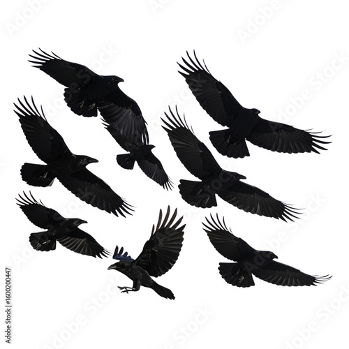 © MdAbdur, Naklejka premium Silhouetted Flock of Crows Flying Against Transparent Background