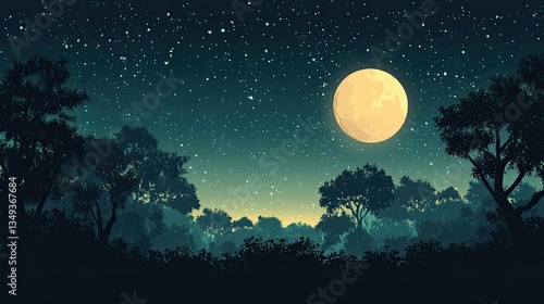 Naklejka premium Silhouetted forest at night under a full moon