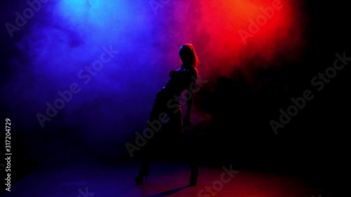 © Олег Фадеев, Naklejka premium Silhouetted girl dancing in the dark on a background of smoke smoke red and blue