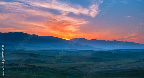 Fototapeta premium Silhouetted Green rolling hills at dusk. Pink, red, orange sunset over...