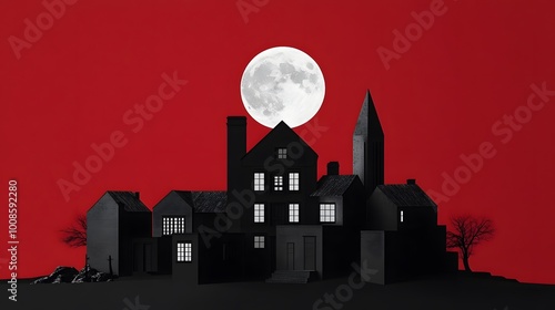 Fototapeta premium Silhouetted haunted house against a full moon and eerie red backdrop.