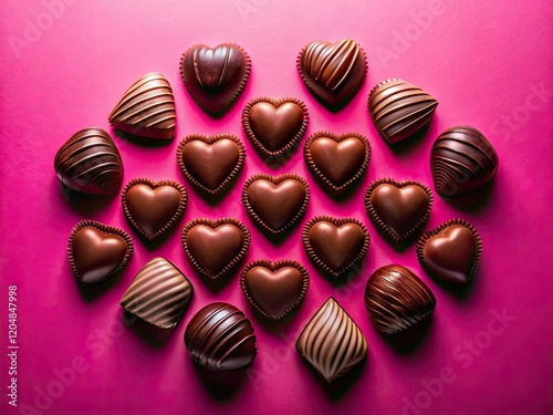 © Autun, Obraz premium Silhouetted heart chocolates, a romantic dessert, beautifully framed against a soft pink backdrop.