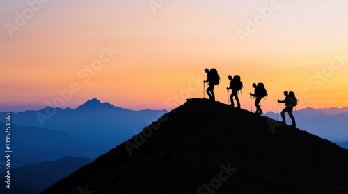 © Generative by J, Fototapeta premium Silhouetted hikers on a breathtaking mountain peak at sunset