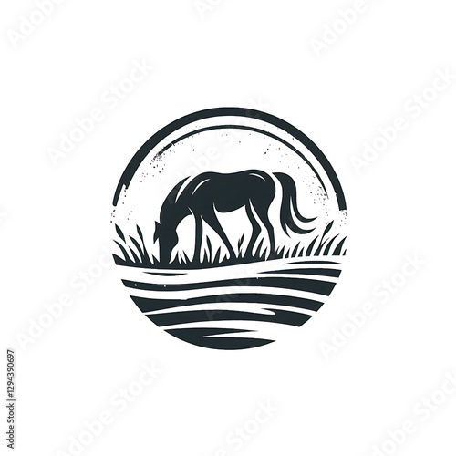 © Indri, Fototapeta premium Silhouetted horse grazing near water, vintage style design.