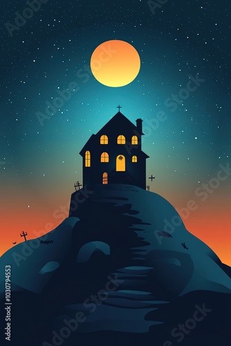 Naklejka premium Silhouetted house on hill under moonlight, stars dotting night s