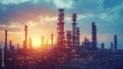 © sadewotito, Fototapeta premium Silhouetted Industrial Complex at Sunset