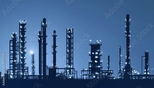 Obraz premium Silhouetted industrial skyline at night, showcasing illuminated towers and structures against a dark blue backdrop.