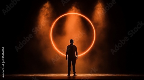Obraz premium Silhouetted man stands before a glowing orange ring on a dark stage with...