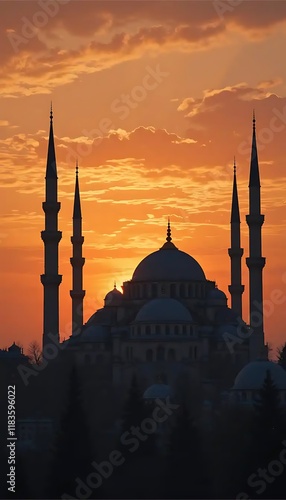 © CindhyAde, Fototapeta premium Silhouetted Mosque at Sunset: A Dramatic Architectural Scene