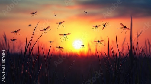Obraz premium Silhouetted Mosquitoes Against a Vibrant Sunset in a Field