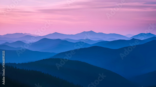 Obraz premium Silhouetted mountain ranges at sunset with a pink and blue sky.