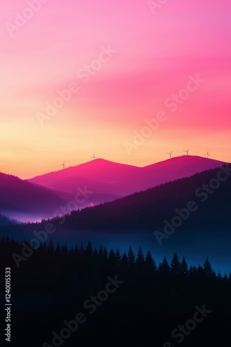 © talkative.studio, Fototapeta premium Silhouetted Mountains Windmills Sunset Scenic View
