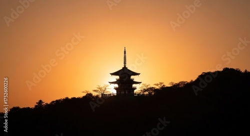 © arif, Obraz premium Silhouetted pagoda against a bright, warm sunset sky, on a forested hill