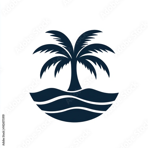 © Mundhut, Fototapeta premium Silhouetted palm tree on island, ocean waves, graphic design, illustration, vacation, logo, poster, print