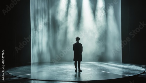 Obraz premium Silhouetted person on stage in spotlight.