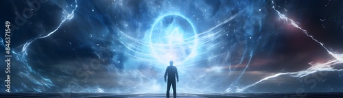 Fototapeta premium Silhouetted person running through futuristic space-time portal with lightning and blue light