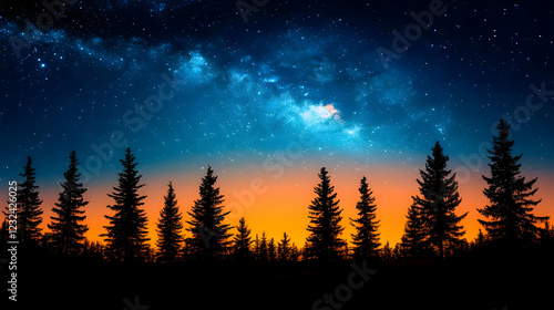 © Siasart Stock, Fototapeta premium Silhouetted Pine Trees Stand Against Vibrant Sunset and Starry Night Sky with Milky Way