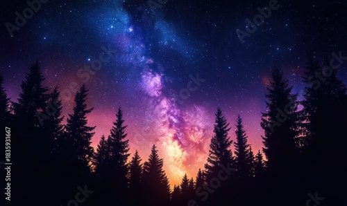 © k, Fototapeta premium Silhouetted pine trees under a vibrant starry night sky with a glowing purple and orange Milky Way galaxy stretching vertically
