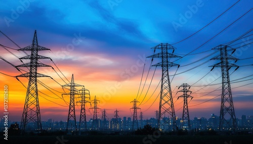 © Agung, Fototapeta premium Silhouetted Power Lines Against a Vibrant Sunset Cityscape