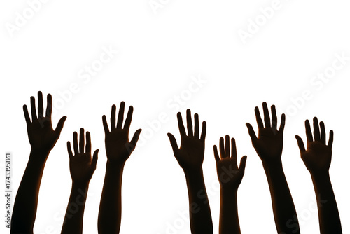 © Pixels Hunter, Obraz premium Silhouetted raised hands isolated on white background, minimalistic style, symbolizing social unity, equality, and participation. Ai generative
