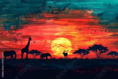 Naklejka premium Silhouetted safari animals, sunset colors, abstract horizon