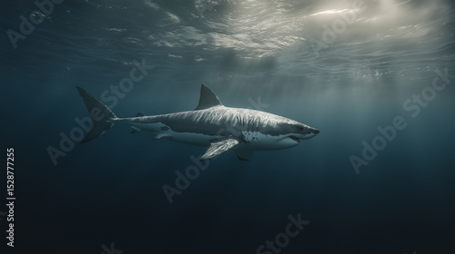 Fototapeta premium Silhouetted shark gliding through deep ocean with dramatic light rays above.