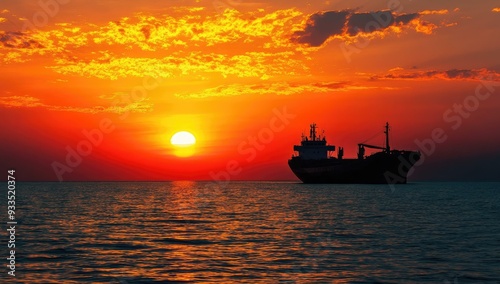 © Murda, Fototapeta premium Silhouetted ship sailing at sunset.