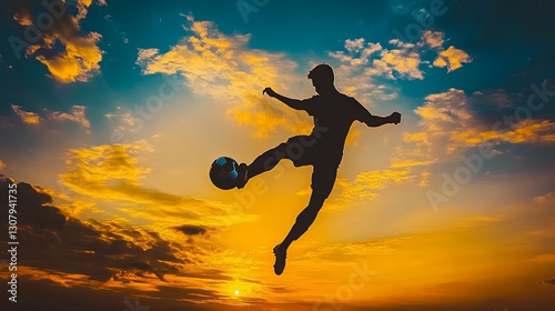 © NOVI, Naklejka premium Silhouetted Soccer Player's Sunset Kick: A Dramatic Sports Image