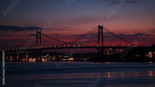 © zhongyou, Fototapeta premium Silhouetted suspension bridge at dusk with city lights