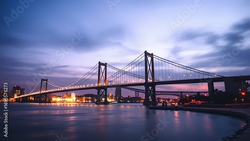 Naklejka premium Silhouetted suspension bridge at dusk with city lights