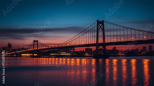 © Yang, Fototapeta premium Silhouetted suspension bridge at dusk with city lights