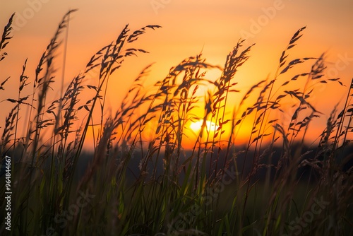 Fototapeta premium Silhouetted tall grasses sway against glowing orange sunset, peaceful meadow...