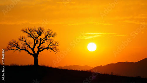 © Andrey, Fototapeta premium Silhouetted tree at sunrise with vibrant orange sky
