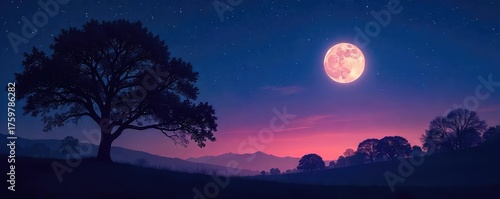 © Wachiraporn, Fototapeta premium Silhouetted trees against a starlit sky, ethereal moonlight illuminating a peaceful, serene night scene Perfect for spiritual, meditation, or nature themes , quiet, dark, yoga